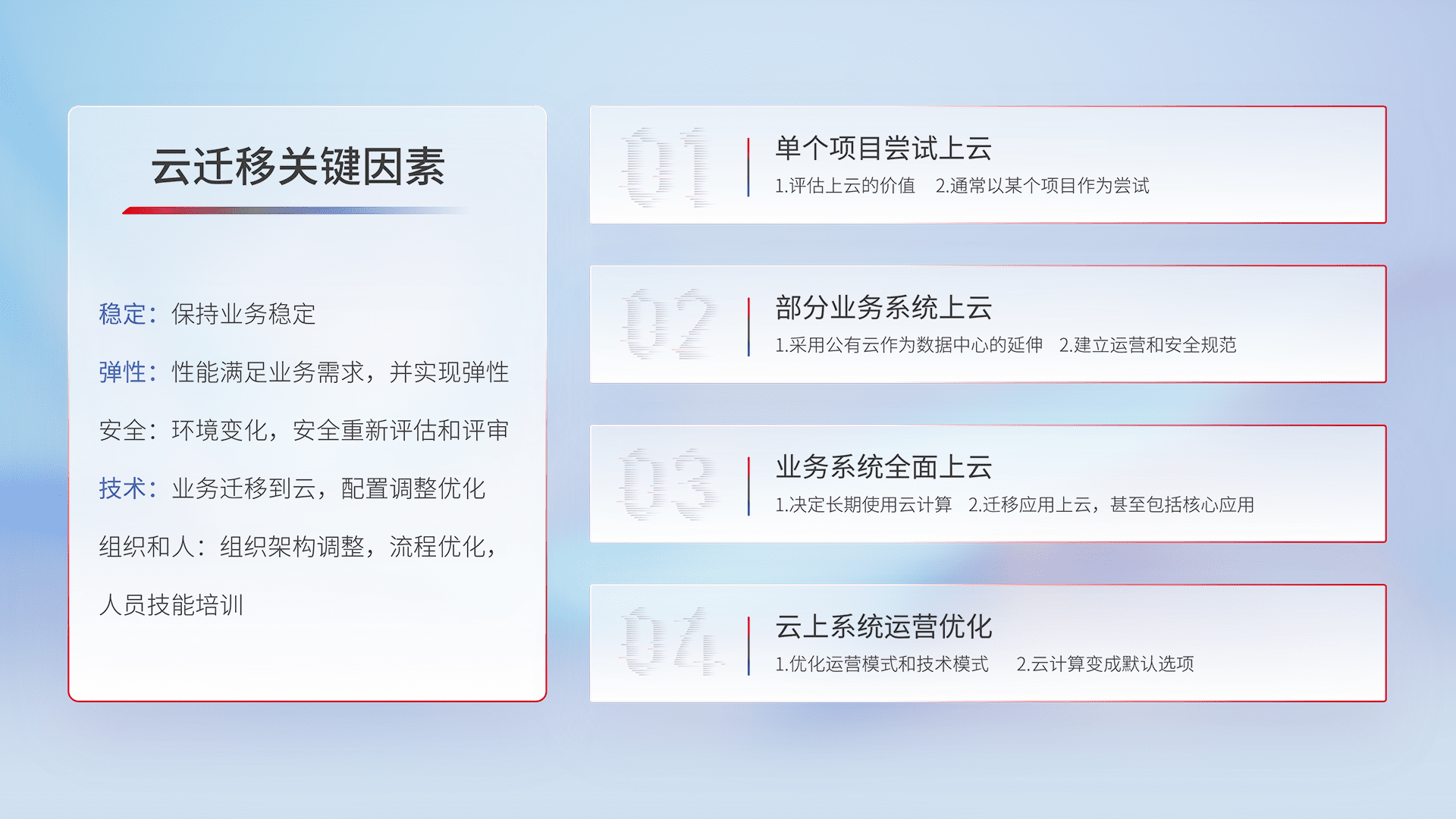 结合实际业务,,,,从规划设计、、、、云平台选型、、云原生改造、、、数据迁移、、集成交付,,,迁移全过程为客户识别最佳上云路径,,,,做好风险识别管理,,,,设计网络架构、、、身份权限、、、安全审计合规、、、操作审计、、、、日志审计、、、、监控告警策略、、、多站点容灾设计等,,,,对云上基础设施进行整体规划,,,提升IT治理水平,,,以满足弹性、、高可用、、、、高性能的需求。。。