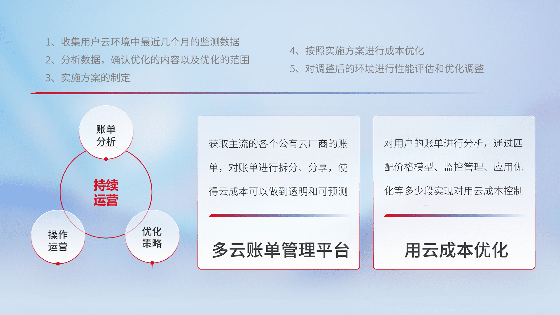 通过灵活运用多种自动化迁移工具,,,帮助企业用户实现业务和数据高效 、、、稳定的上云迁移和云上迁移,,,,采用自研多云纳管平台,,,以中立管理模式,,解决多组织、、多云、、、、多运维厂商的复杂关系的管理,,,,保证多云平台资源配置的一致性,,,,实时掌控云资源运行数据,,,运用智能化工具分析云资源多云平台的管理服务,,透明化管理成本支出,,,,用云成本可预测、、、用云费用可优化、、云资源配额有据可依。。