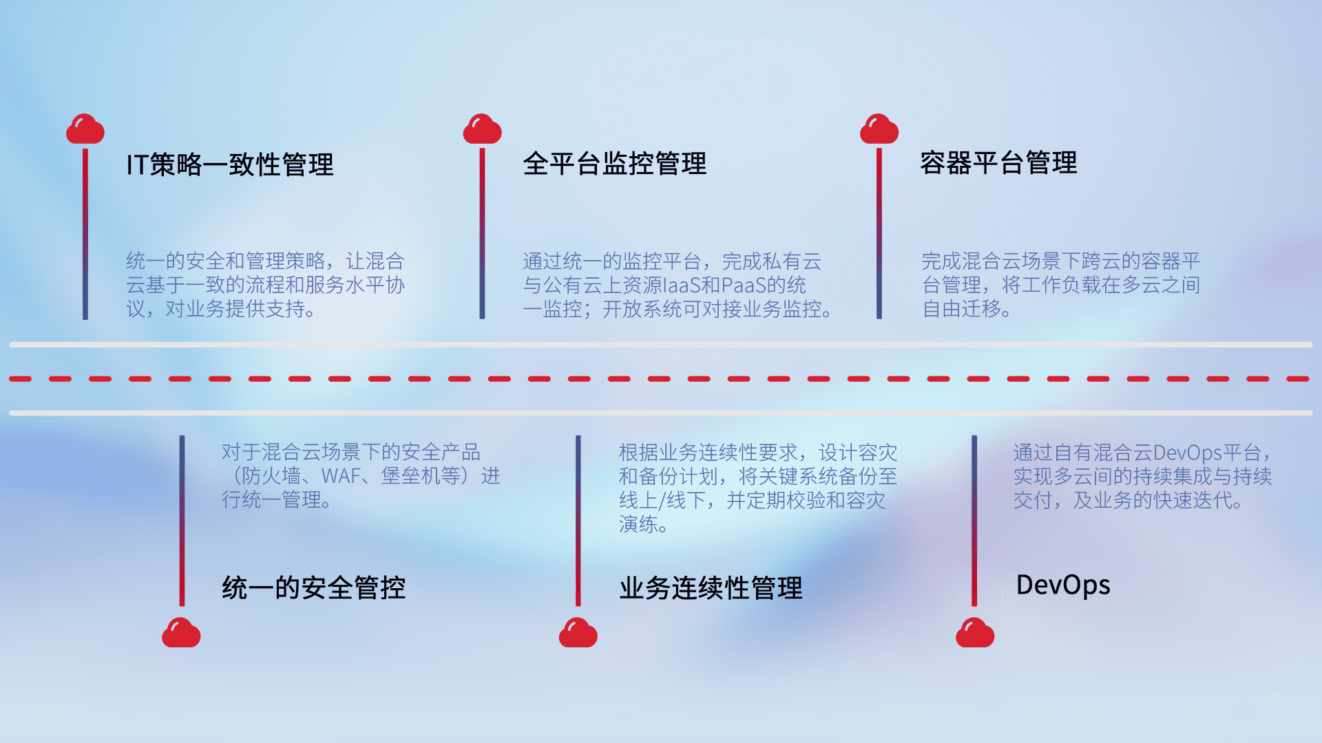 通过多云纳管,,,,以统一的资源数据模型把客户的云资源进行抽象和封装,,进而实现对多云资源的统一操作,,保障云资源管理的可靠性、、、、稳定性与可用性。。。。量身定制化运维内容,,,配置、、开发运维、、补丁管理、、、备份、、、、监控、、、、认证和访问管理、、、、审计和日常巡检等,,,,保障在用云过程中的可靠度,,稳定度以及高可用率。。。