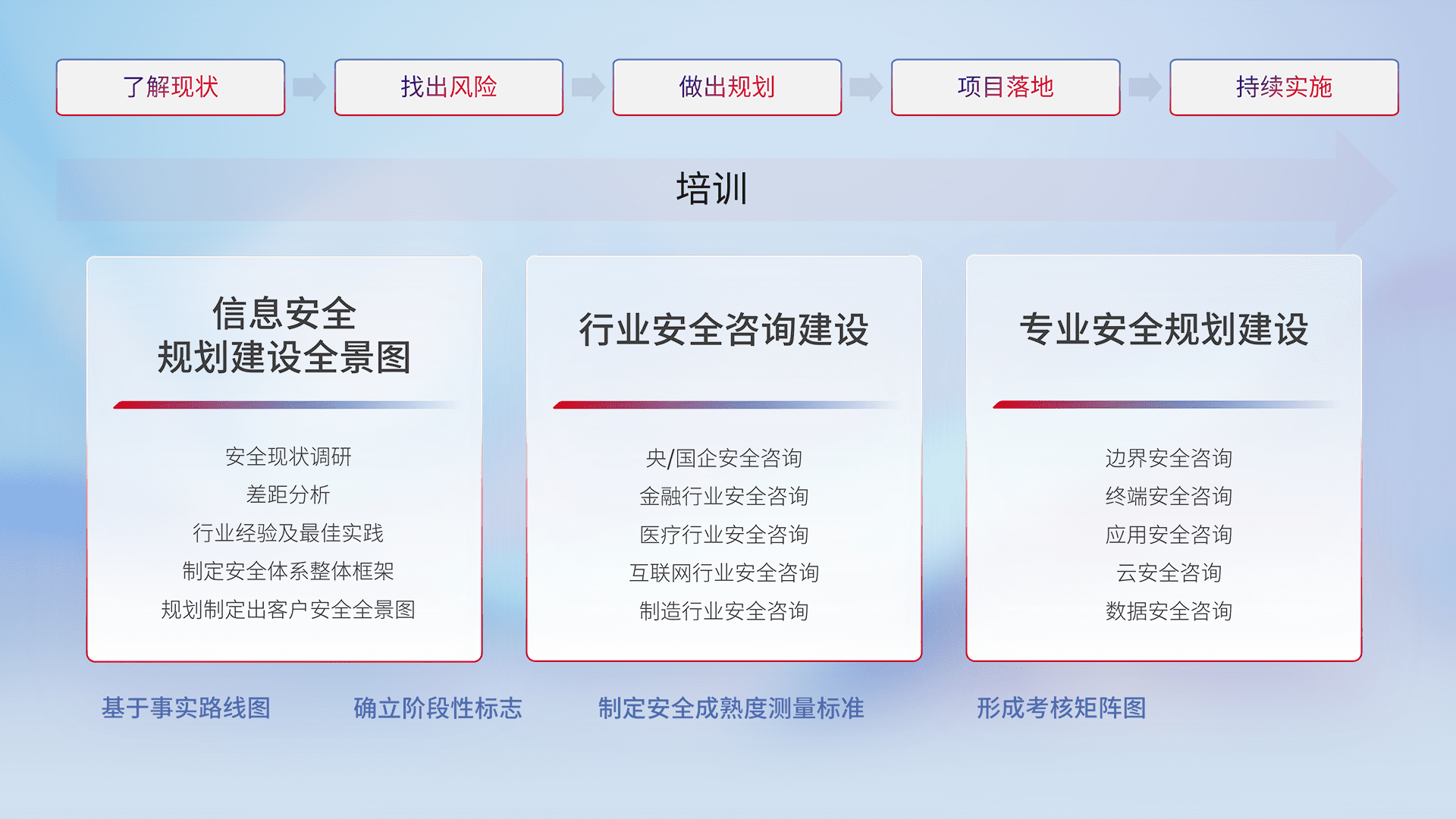 针对客户行业特性,,以专业的安全服务+多厂商联合解决方案提供专属的一站式安全管理服务,,帮助客户全面感知网络空间威胁,,,基于识别、、检测、、、分析、、防护、、、、监测、、响应的服务理论模型,,,,从方案咨询、、、、集成交付、、、评估验证、、优化加固、、、运维运营,,,致力于为客户提供完整的闭环管理式安全服务。。。以实战经验为客户打造高抵御风险的安全体系,,帮助客户发现威胁、、、、对抗威胁、、、处置威胁,,,不断积累安全对抗能力,,,,持续保障数字化安全。。