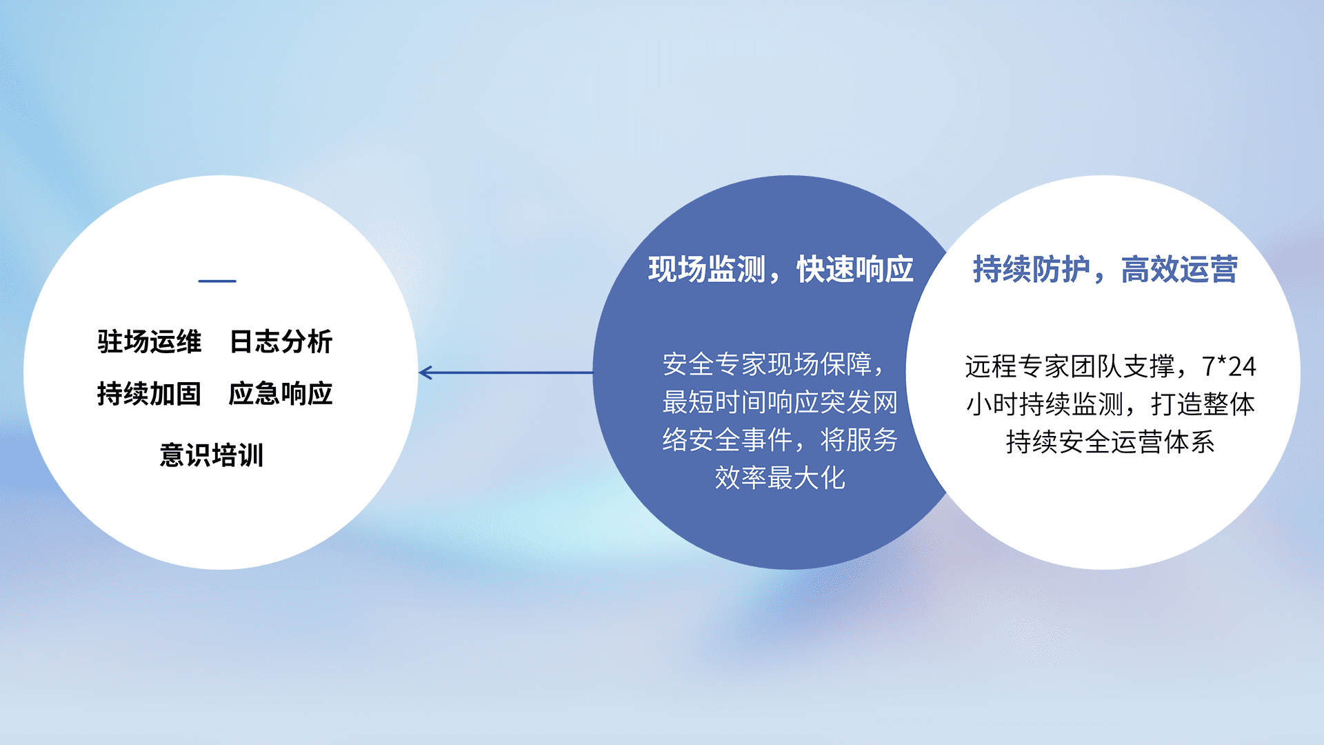 针对客户行业特性,,,,提供专属的一站式安全管理服务,,,,帮助客户全面感知网络空间威胁,,,,通过安全专家的线上、、、、线下防护支持,,,实现风险闭环,,,,将安全保障常态化,,,,为客户打造常态化安全运维运营服务。。