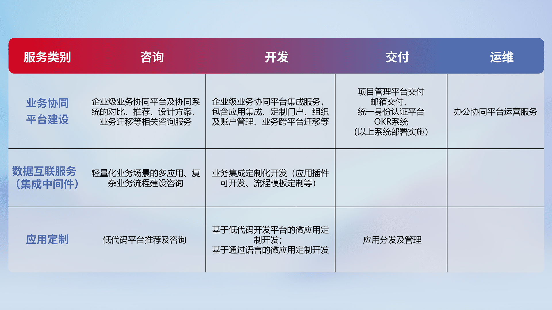 针对钉钉、、、企微、、IDaas等平台级产品提供产品的规划、、、方案、、、、交付、、、、定制化开发等服务,,实现如统一协同办公、、、智能客户服务、、、混合会议管理、、、、智能数据查询、、等业务场景,,,实现数字化转型。。。。